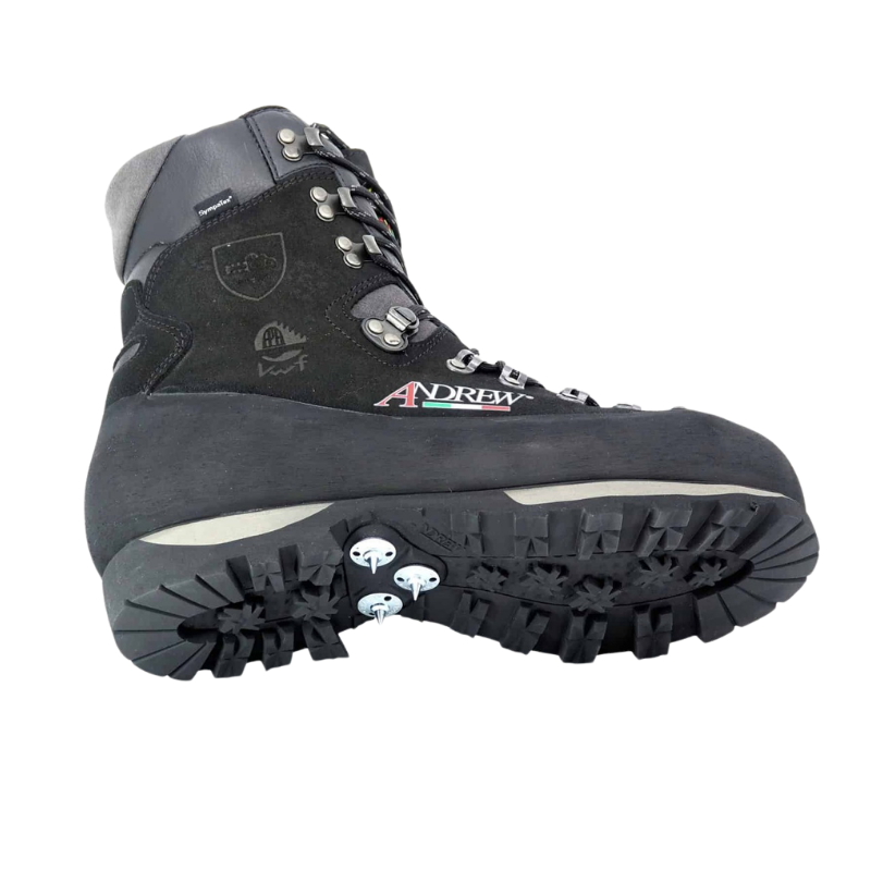 Upper: Premium full grain 3.0mm Perwanger leather, padded double tongue, leather collar, heel billow, Kevlar chainsaw protection class 3 Membrane: Sympatex Moisture Tech Midsole: Rubber Outsole: Andrew Magma Spiked, Chemical resistant, replaceable carbon steel spikes 6mm thread Rigidity: Rigid Footbed: Iso-therm-memory foam-leather Sizes: UK8-13