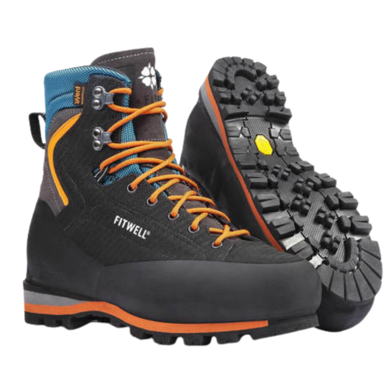 These Italian-made Class 3 boots weigh 1020g per boot (size 43). Featuring a snug fit, antibacterial insole, and a 4-layer eVent membrane, they provide exceptional comfort and waterproof performance even in demanding climbing conditions. The Fitwell Chop boots are equipped with a Vibram Montagna sole and EVA soft wedge for superior grip. The leather construction is enhanced with a carbon finish layer and suede carry-repellent, while the cut-resistant Kevlar fabric inserts, breathable and waterproof membrane, and perforation-resistant insole ensure maximum durability.