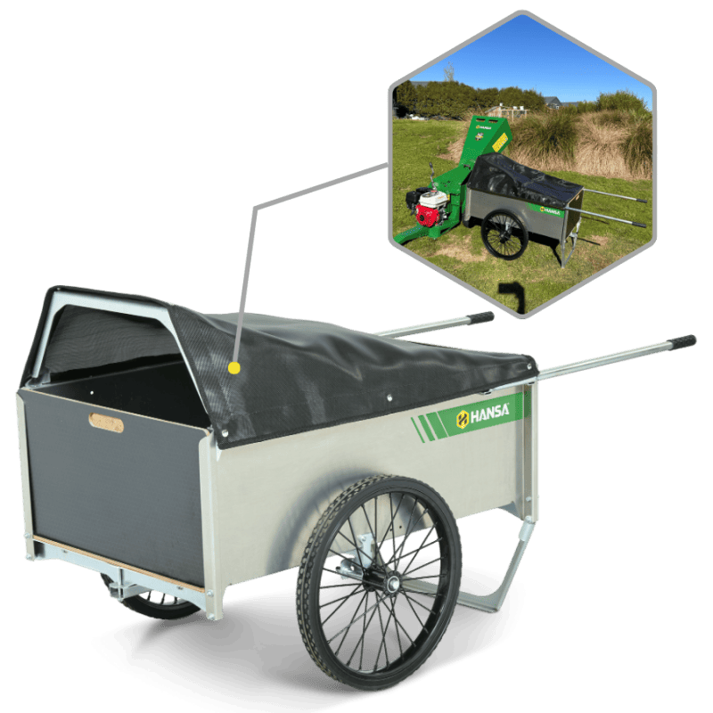 Say Goodbye to Mess and Double Handling Collect mulch directly from your Hansa C7 chipper with the Hansa Handcart — no more sweeping or wasted time. A fitted cover keeps everything contained, so your workspace stays clean and efficient.