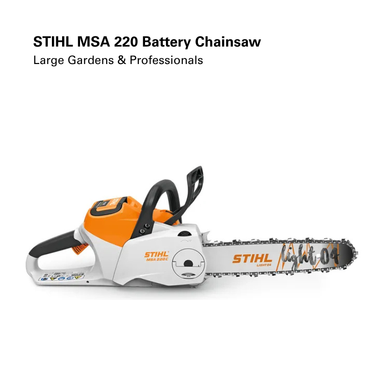 STIHL MSA 220 C-B Battery Chainsaw Standard Bar Length: 16″ STIHL Battery Range: AP 300 S Weight: 3.6 kg