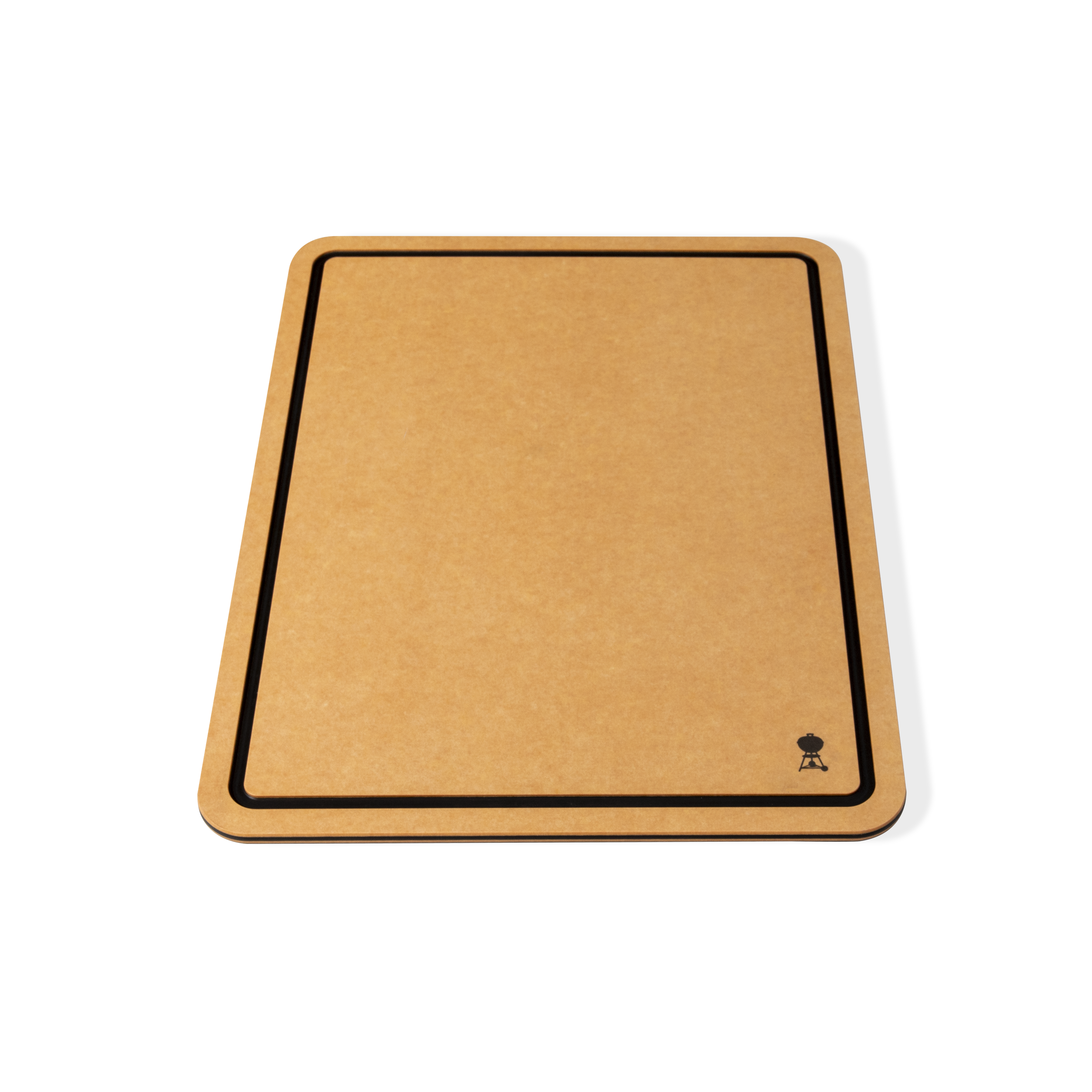• Drops into Weber Works™ side table to create a prep space • 2-sided cutting board to prep or serve on either side • Juice groove keeps liquids away from food and countertops • Dishwasher safe