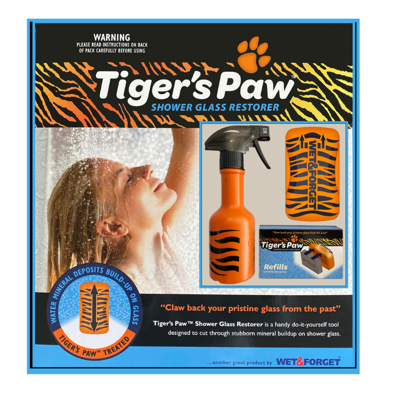 Cut Through Stubborn Mineral Build up On Shower Glass with Our Scrubber Fed up with those stubborn calcium deposits? Fear not, Tiger’s Paw is here to give your glass the deep exfoliation it deserves. Unlike other cleaners that just leave you clawing at the problem, Tiger Paw’s unique restorer block cuts through those built-up minerals with ease. It’s the purr-fect solution for a sparkling shower door.